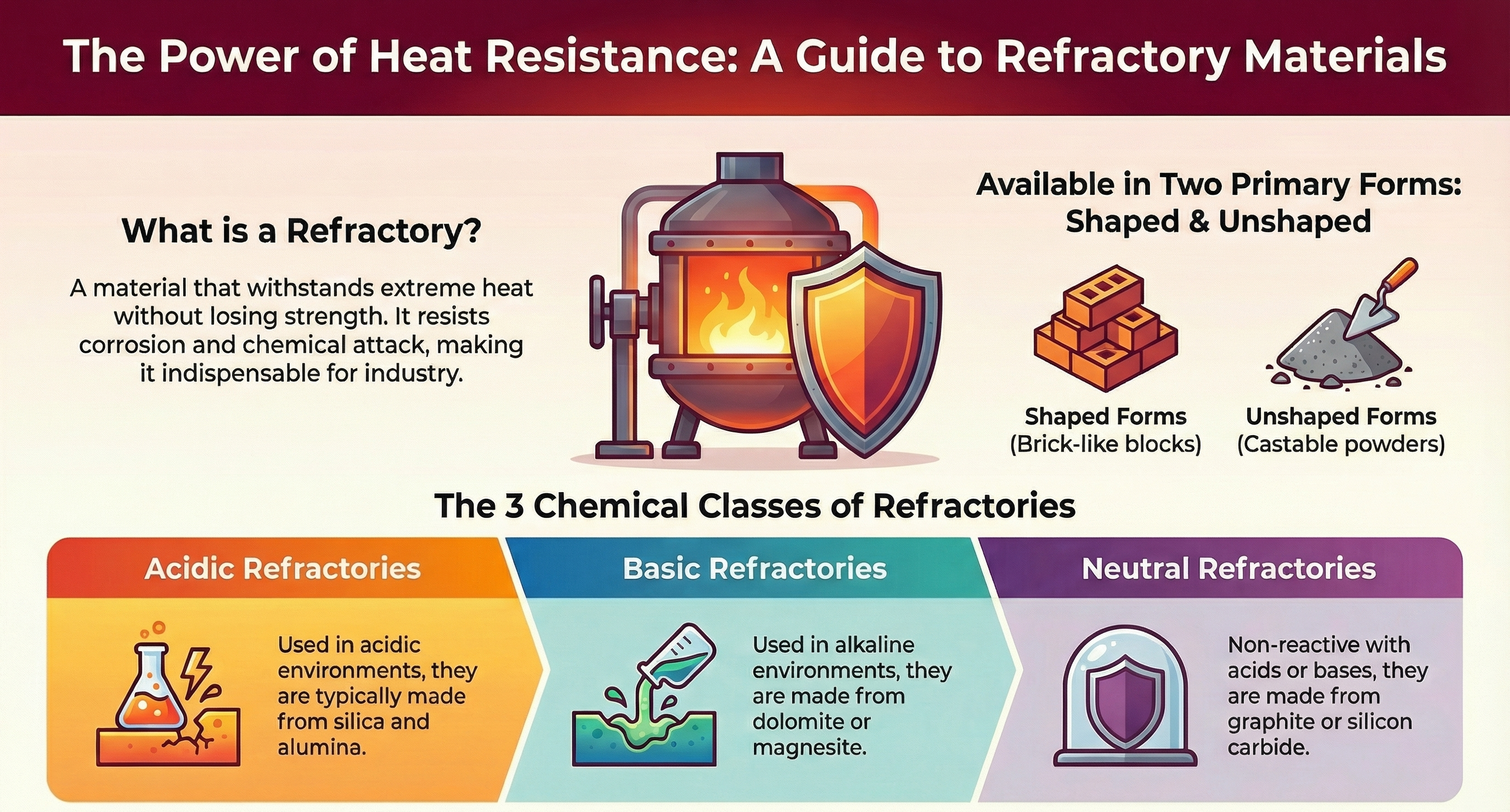 Refractory is a special material that can withstand extremely high temperatures. It does not melt, deform or lose its structural strength even under intense heat. The heat resistance of this material is very high, it has anti-corrosion properties and is completely stable against chemical reactions. It has become indispensable in the industry as its quality is maintained even under difficult conditions such as heat, abrasion or chemical attack. Many industries also rely on